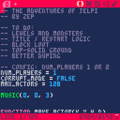 PICO-8 has tools for editing code, music, sound, sprites, maps built right into the console. Create a whole game or program in one sitting without needing to leave the cosy development environment!