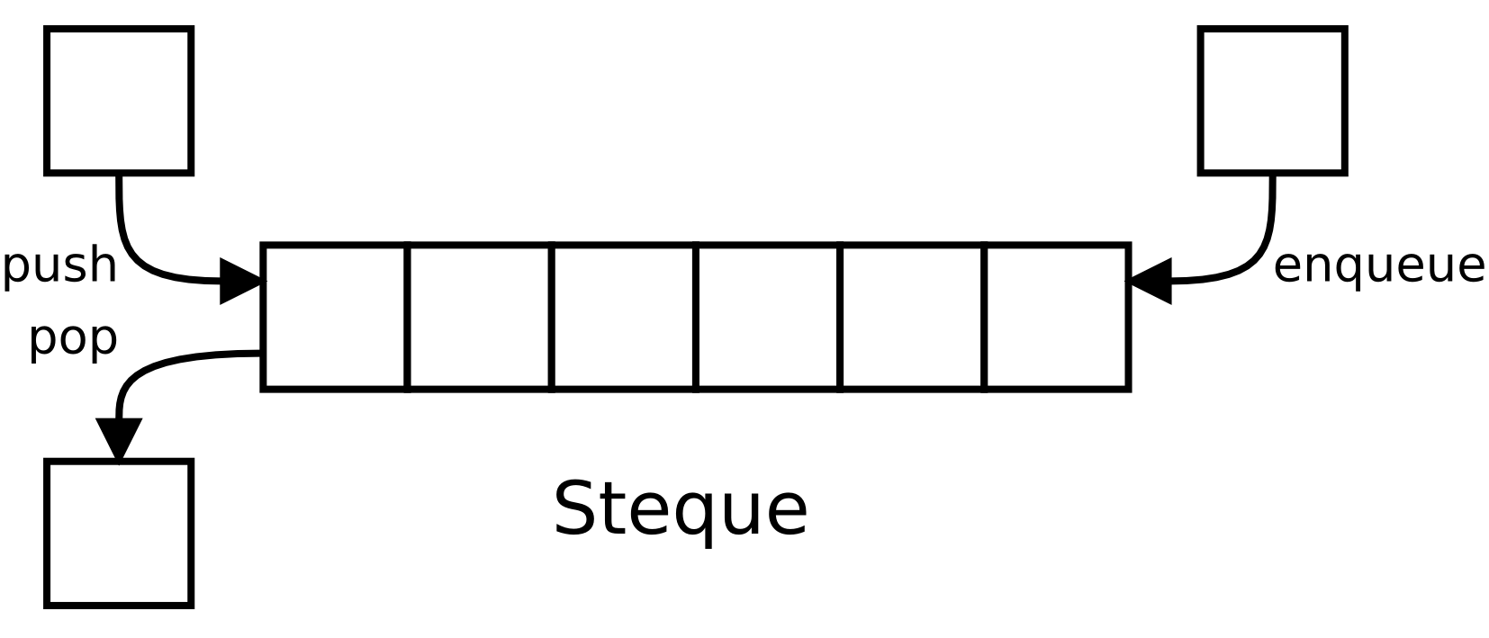 A stack-ended queue, or steque, is a data type that supports the operations push, pop, and enqueue. Donald Knuth calls it an output-restricted deque. In other words, a steque allows for data to be added to either end (top with push, bottom with enqueue) but removed from only one end (top with pop). The figure below provides an illustration of the manipulation operations of a steque.