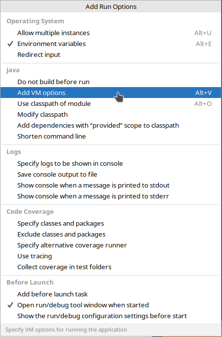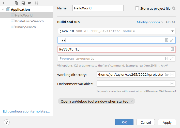 To enable assertions in the VM, edit the project's configuration, click Modify options dropdown, click Add VM options, then type -ea in the newly added VM options textbox.