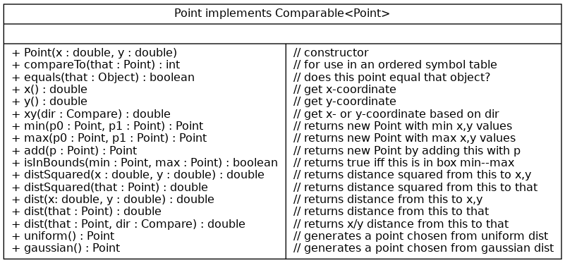 dist. ThedistSquaredmethod computes the squared distance. PointisComparableand it contains several functions/methods for generating comparators to comparePointobjects in different ways.xyComparator(): compares x first, then yyxComparator(): compares y first, then xpolarRadiusComparator(): compares polar radius (dist from \((0,0)\))distanceToComparator(): compares dist betweenthisand anotherPointPoint.compareTo(): compares y first, then x (same asyxComparator())