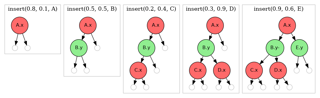 Search and Insert. The algorithms for search and insert are similar to those for BSTs, but at the root we use the \(x\)-coordinate (if the point to be inserted has a smaller \(x\)-coordinate than the point at the root, go left; otherwise go right); then at the next level, we use the \(y\)-coordinate (if the point to be inserted has a smaller \(y\)-coordinate than the point in the node, go left; otherwise go right); then at the next level the \(x\)-coordinate, and so forth.