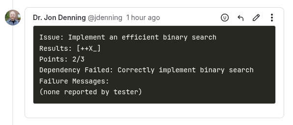 But, you must commit, push, and mark issues ready for testing to get this helpful feedback!
