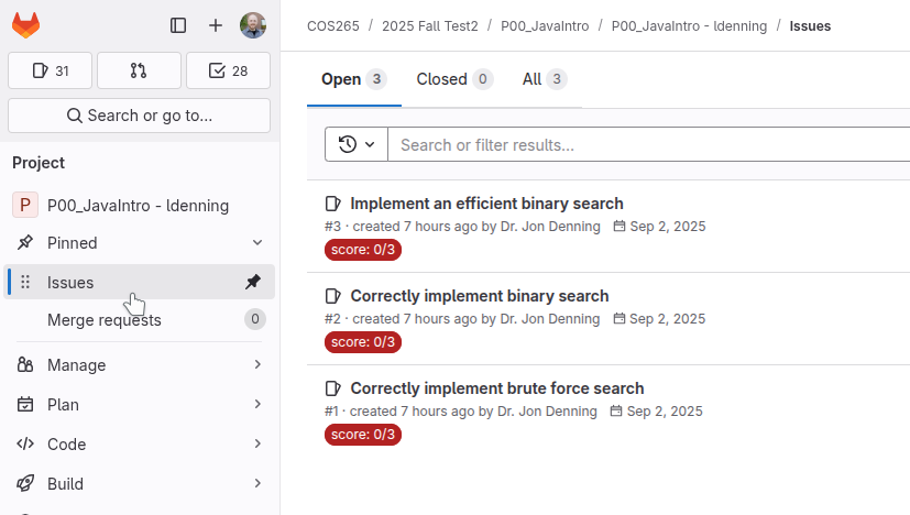 Note that initially every issue will have a label of score 0/3 (or some multiple of 3), because you have not solved that problem yet.