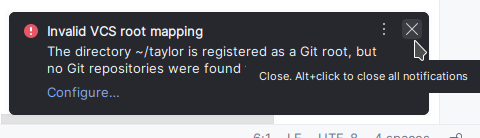 Invalid VCS root mapping, you can safely ignore it by simply clicking the × in the top-right corner of the warning.