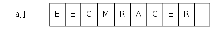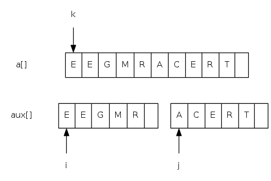 merge(a, aux, 0, 1, 3) E G M R . . . . . . . . . . . .