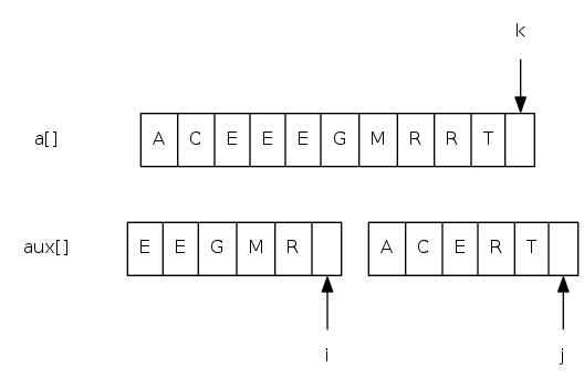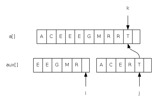 merge(a, aux, 8, 9, 11) . . . . . . . . A E T X . . . .