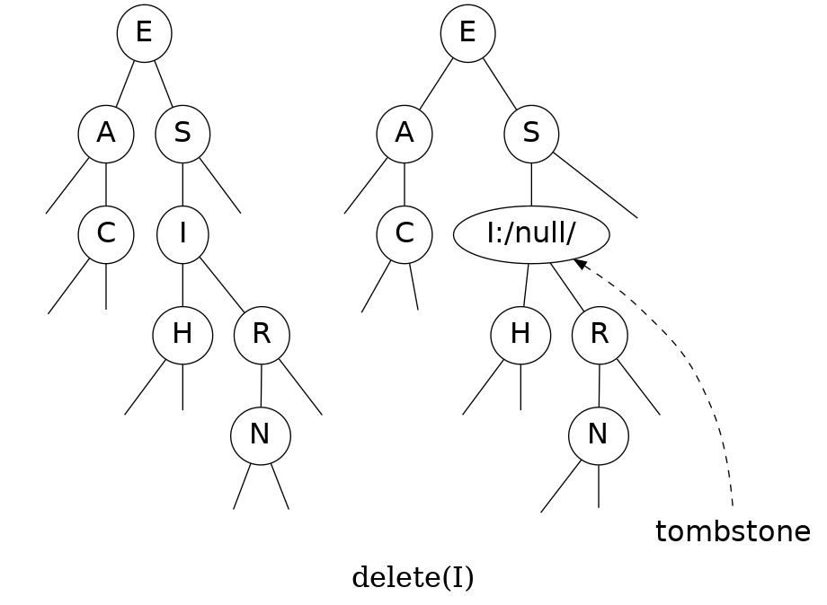 Cost: \(\sim 2 \ln N'\) per insert, search, and delete (if keys in random order), where \(N'\) is the number of key-value pairs ever inserted in the BST.