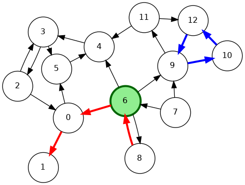 vertex 6 (green) has outdegree=4 and indegree=2
