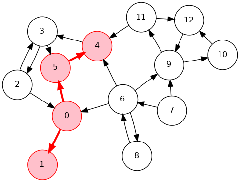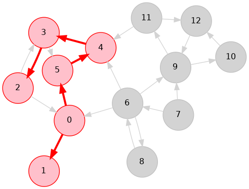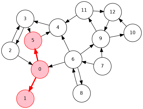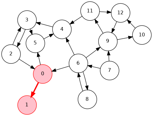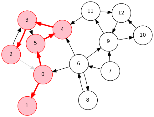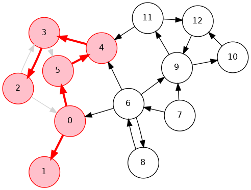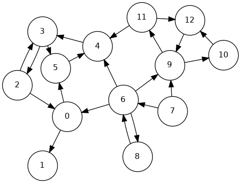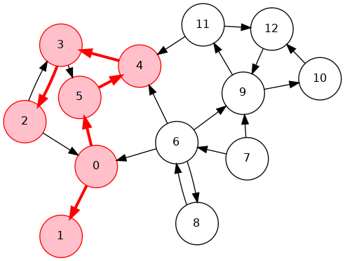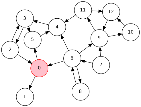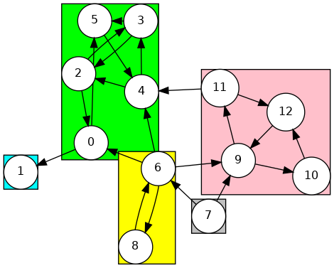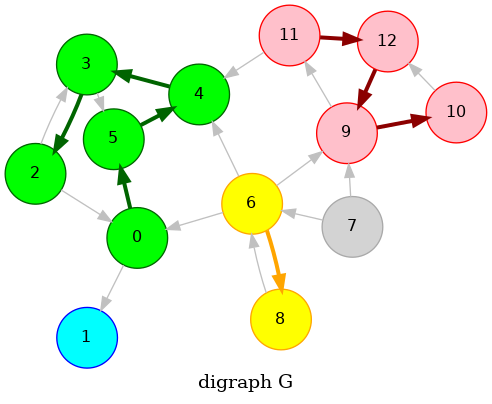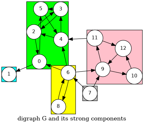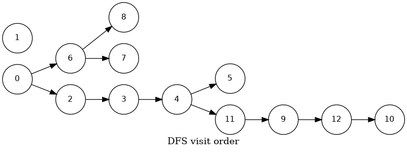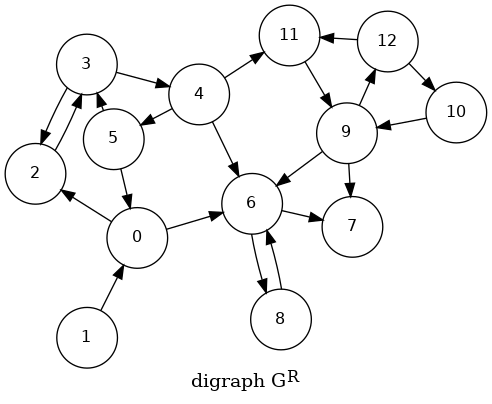 0->6->8, 6->7, 0->2->3->4->5, 4->11->9->12->10, 18 7 6 5 10 12 9 11 4 3 2 0 11 0 2 3 4 11 9 12 10 5 6 7 8Phase 2: Run DFS in \(G\), visiting unmarked vertices in reverse postorder of \(G^R\)