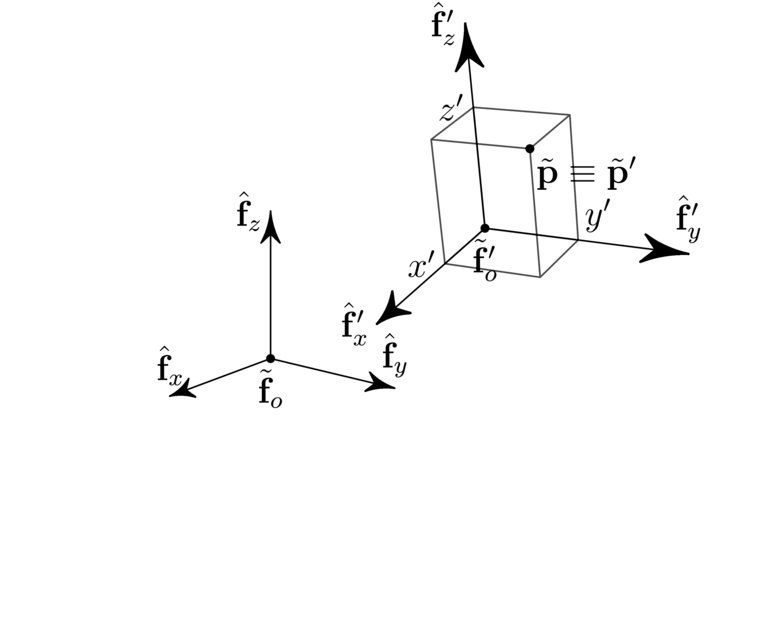 - \(\tilde\p' = (p'_x, p'_y, p'_z)\) is defined wrt to \(\frame{f}'\)